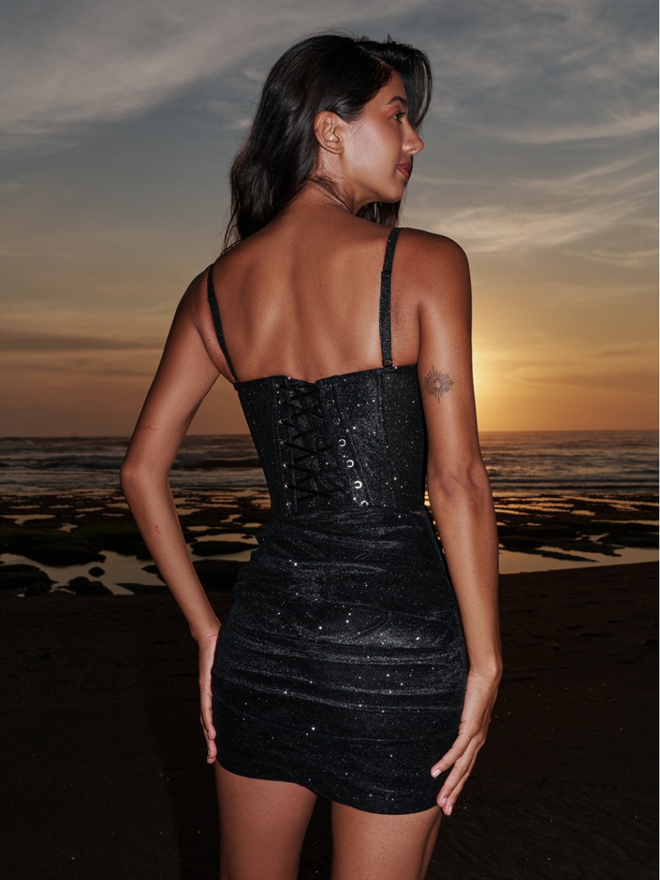The Black Shiny Set "Melaya," featuring a corset and skirt, is crafted to captivate with its bold and elegant design. Made from shimmering black fabric, this set includes a structured corset that enhances your shape and a sleek, flowing skirt that adds movement and sophistication. The deep black shade with its radiant sparkle creates a striking, refined look, perfect for evening events, formal gatherings, or any occasion where glamour meets elegance.