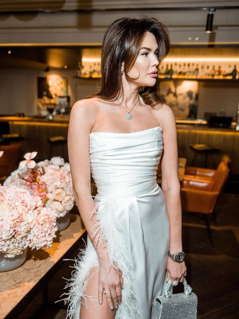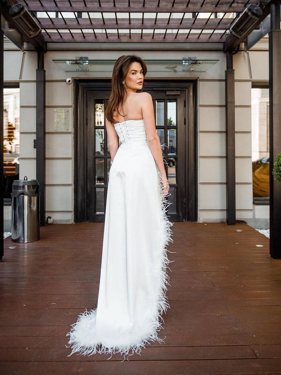 Атласний комплект "Feathers" складається з корсету та спідниці. Виготовлений з якісної атласної тканини. Корсет має драпірування та відмінно допасовується до тіла. Верхня частина комплекту поєднується зі спідницею, створюючи вигляд цільної сукні. Спідниця має високий розріз, а її краї оздоблені пір'ям.