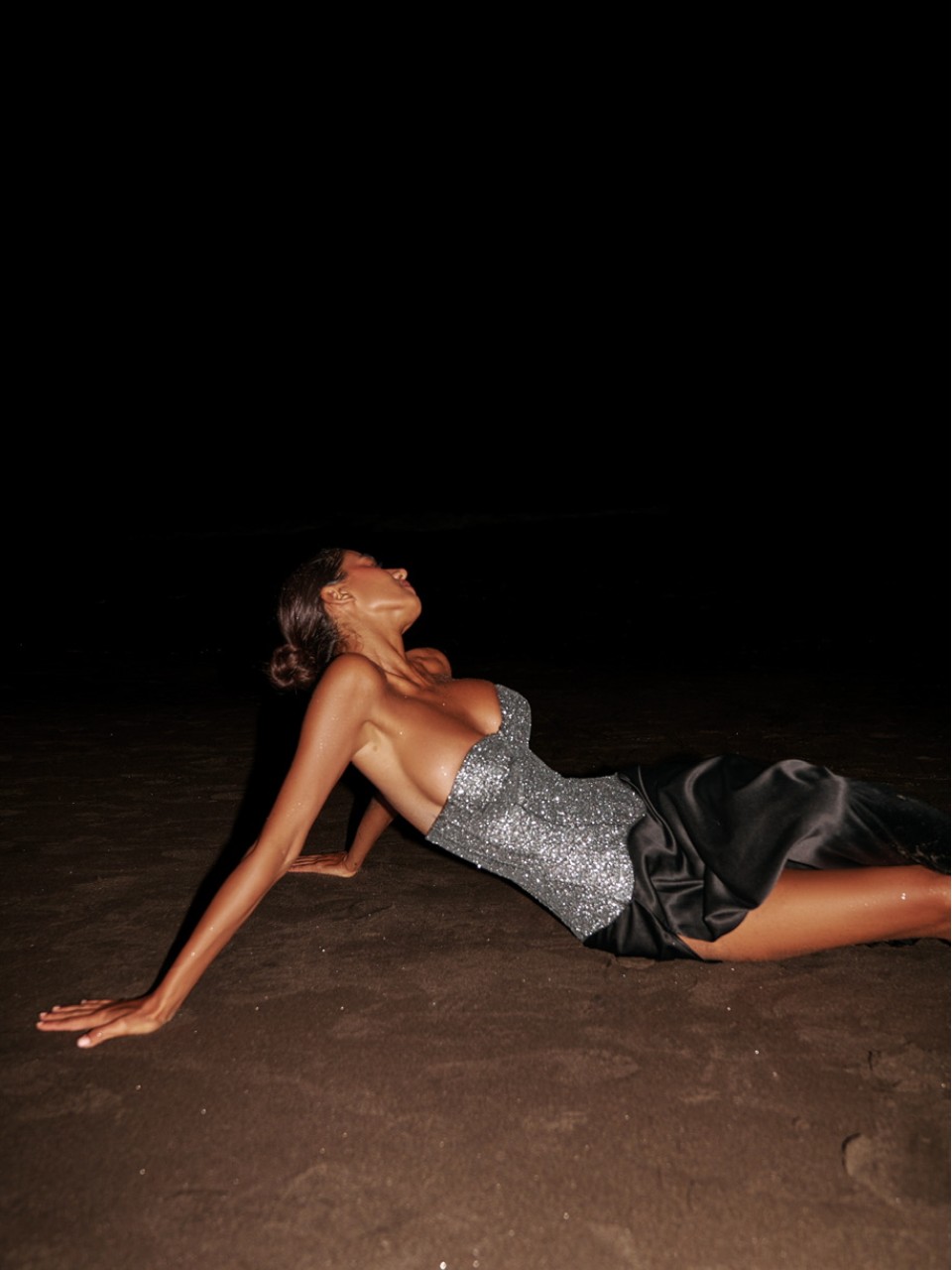 Комплект "Wind Melody," який включає блискучий корсет срібного кольору та чорну атласну спідницю, втілює розкішну елегантність із ноткою блиску. Срібний корсет додає образу яскравості та привабливості, тоді як атласна спідниця створює баланс завдяки своєму плавному, витонченому силуету. Ідеальний вибір для тих, хто хоче справити враження на офіційних заходах або урочистих подіях, де вишуканість поєднується з блиском.