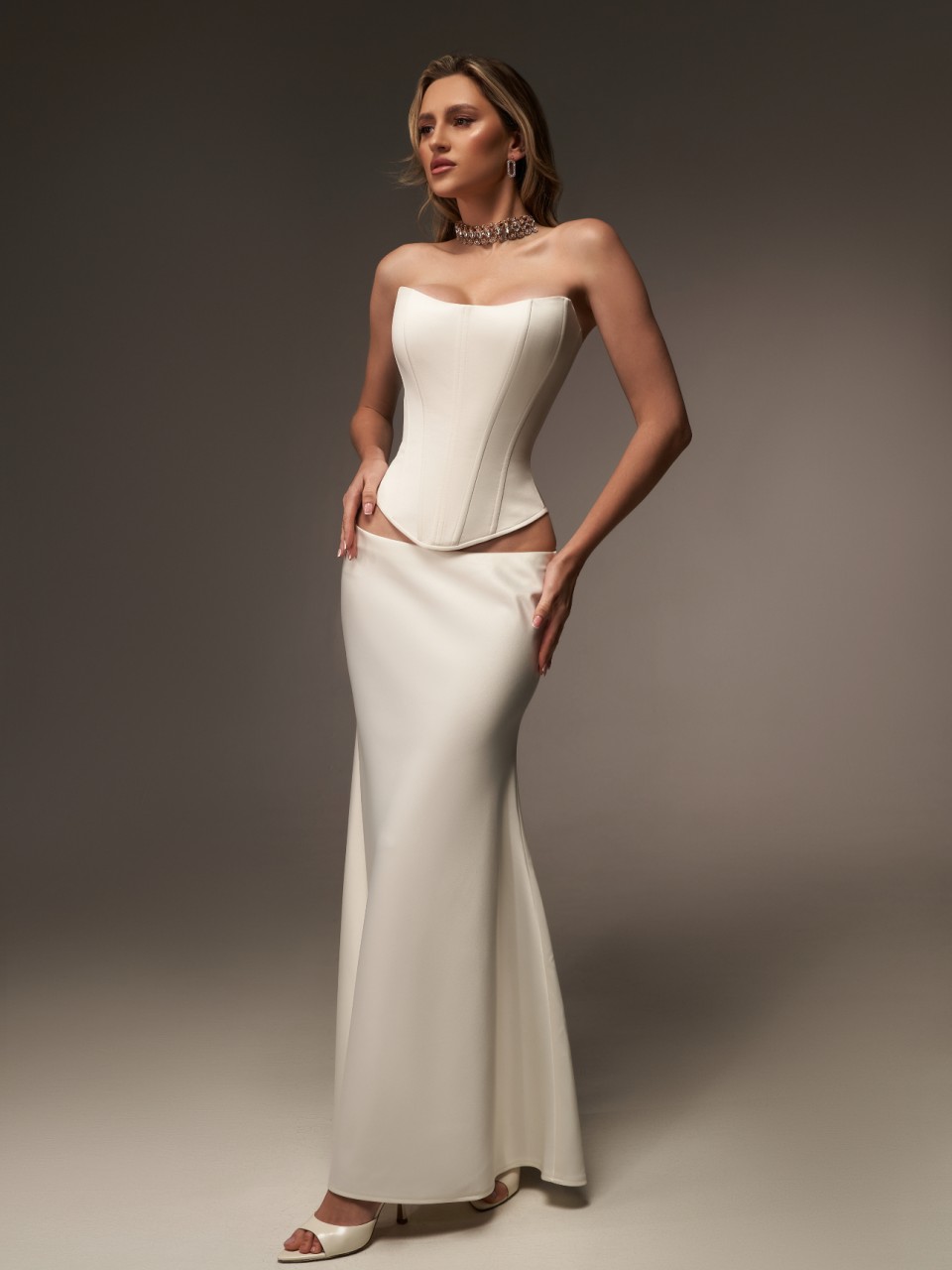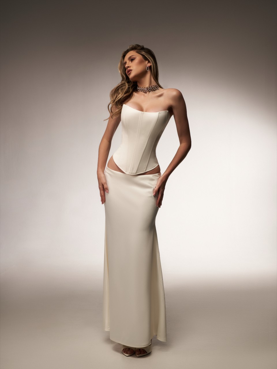 Атласний комплект "Milana" (корсет + спідниця) в кольорі айворі, створений для того, щоб втілити вічну елегантність та ніжну чарівність. Виготовлений з розкішного атласу, цей комплект включає структурований корсет для ідеальної посадки та граційну спідницю з низькою посадкою, яка красиво видовжує силует. Ніжний колір та атласний блиск надають комплекту витонченої елегантності, роблячи його ідеальним вибором для весіль, урочистих заходів або будь-якої події, де ви хочете випромінювати грацію.