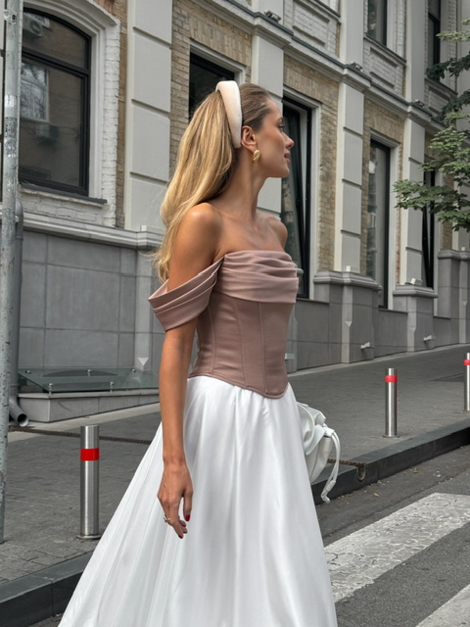 Елегантне драпірування м’яко підкреслює силует, створюючи відчуття легкості та вишуканості. Завдяки продуманому крою та щільній посадці, корсет ідеально моделює фігуру та виділяє груди.