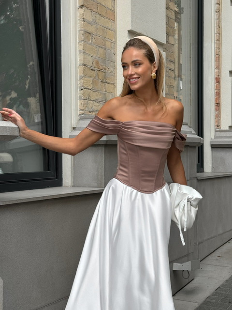 Корсет виготовлений з високоякісного атласу. Атлас щільний та еластичний. Він не деформується, не мнеться та не втрачає свого первісного вигляду. Ідеальний для вечірніх образів.