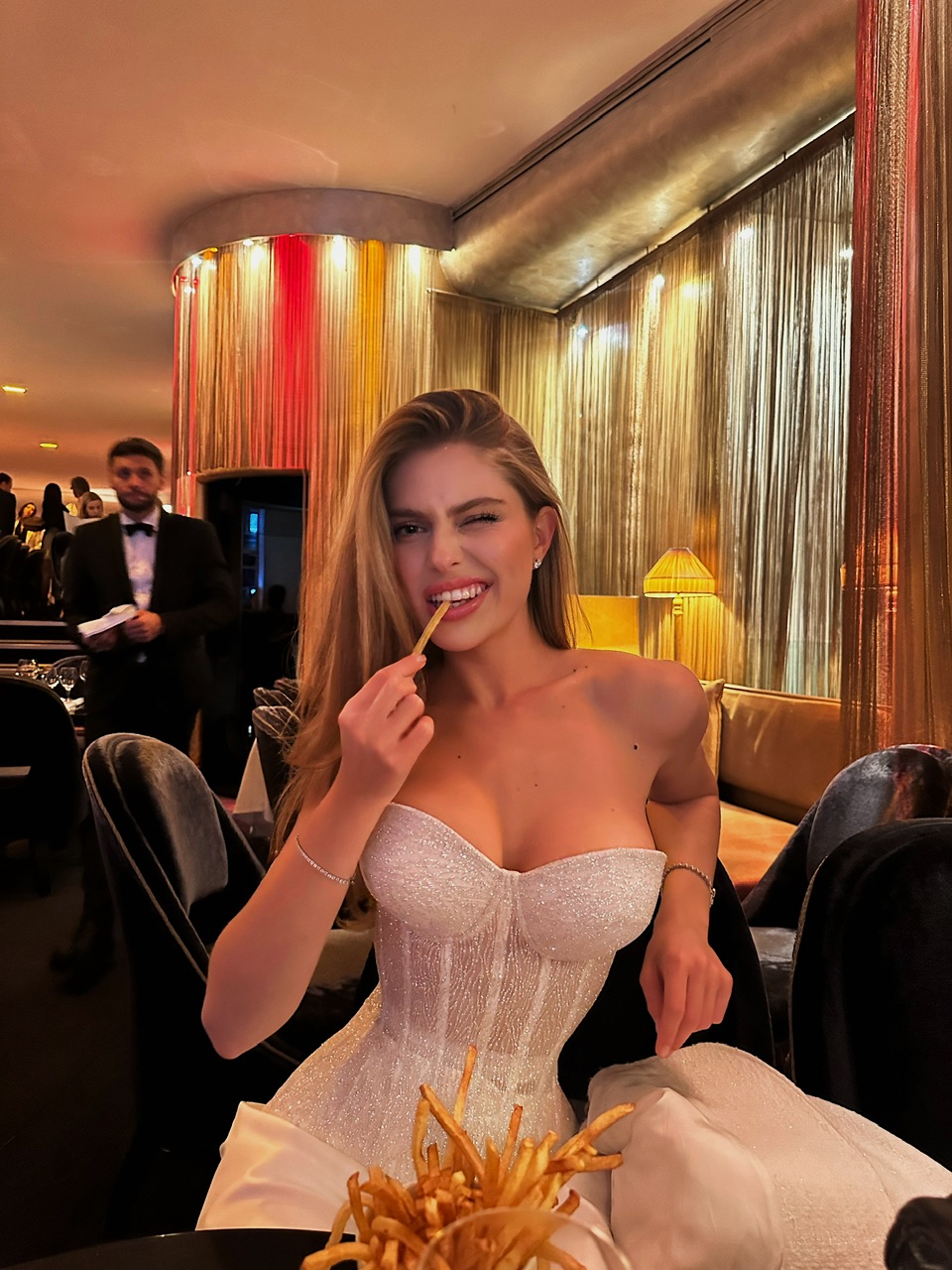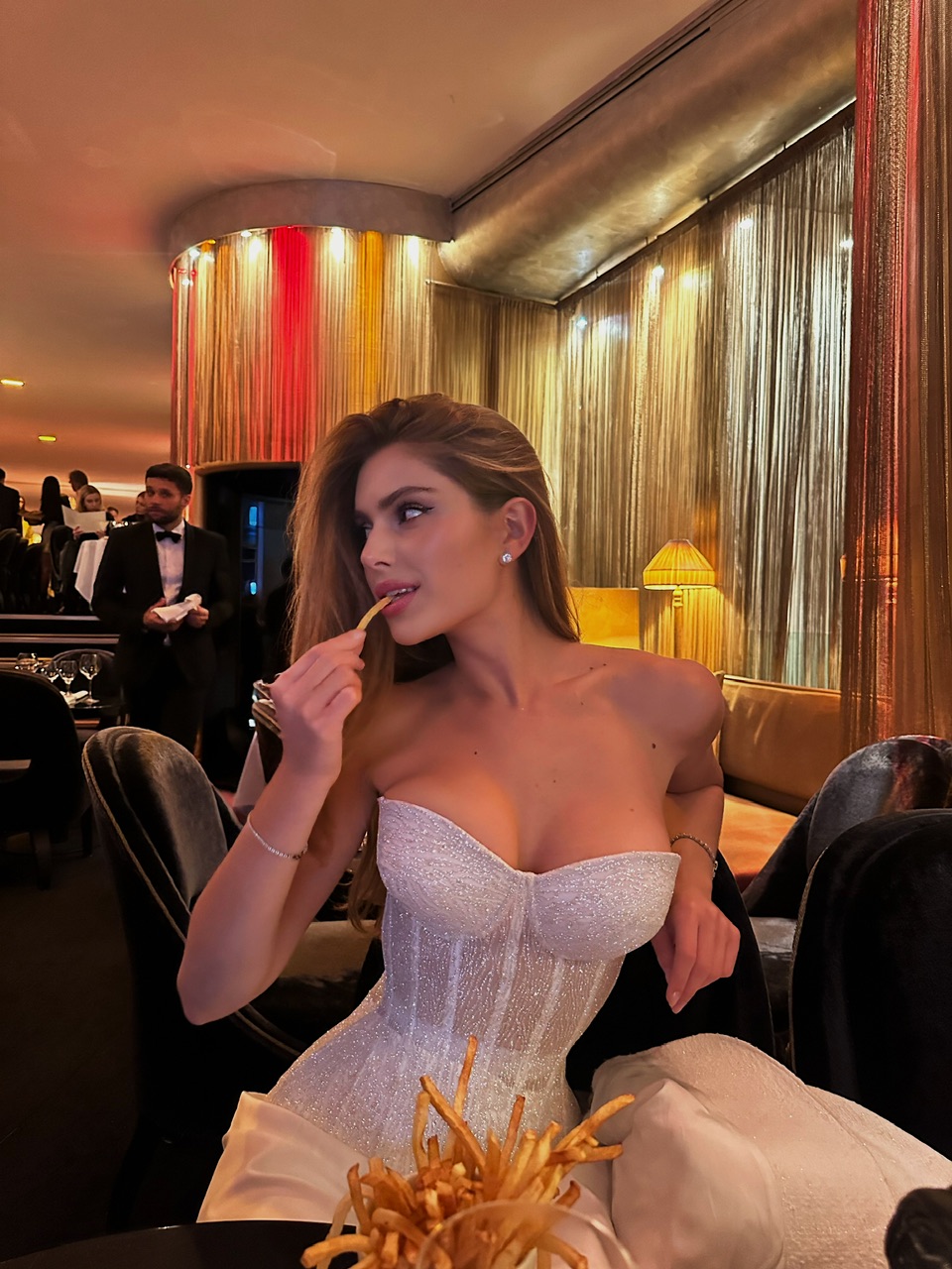 Корсет виготовляється з гліттерної тканини — матеріалу, що створюється шляхом нанесення дрібних блискіток на сітку за допомогою спеціального клею. Тканина добре тримає форму та має розкішний блиск. Вироблено в Туреччині.