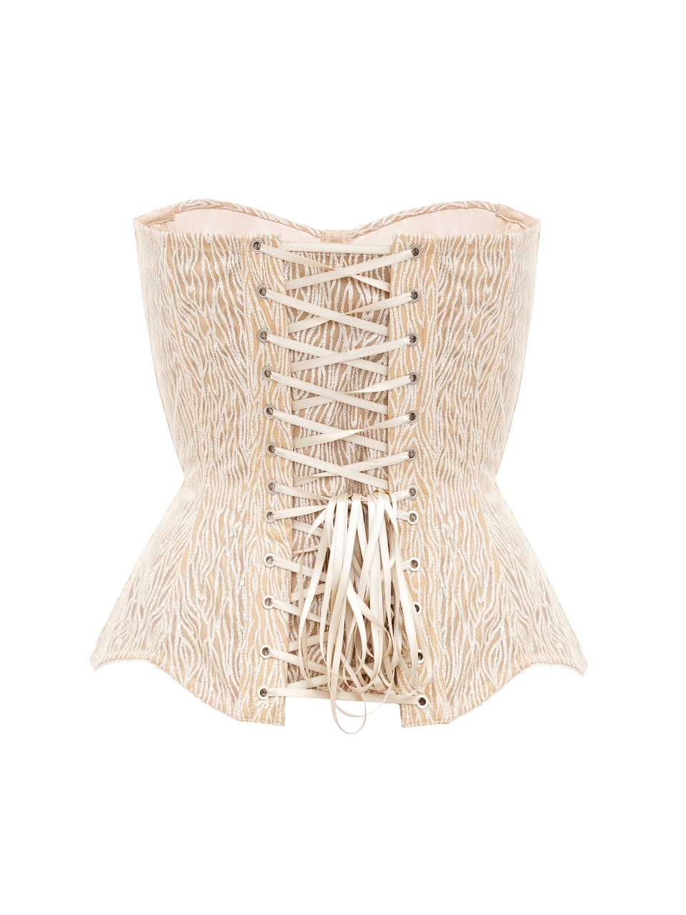 Відшивається з гліттерної тканини. Гліттер – чудовий винахід, який завоювало популярність дуже швидко. Виготовляється шляхом нанесення на сітку дрібних блискіток, за допомогою спеціального клею. Зверху гліттер покриваємо тонкою сіткою, завдяки цьому, корсет стає приємним на дотик.