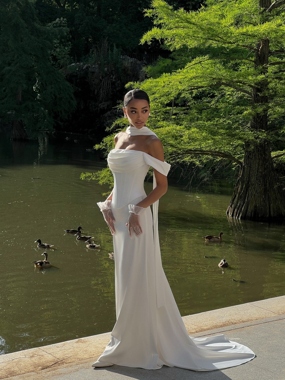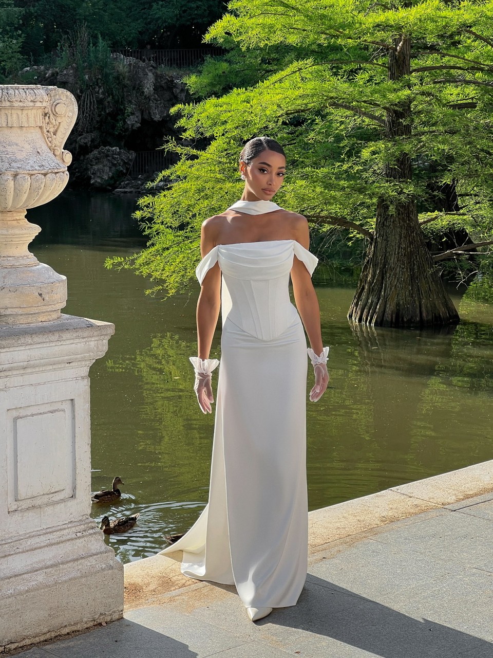 Атласна спідниця зі шлейфом струмить за кожним кроком, мов тінь світла. Чиста лінія, глибоке сяйво тканини і відчуття простору — це мінімалізм, що запам’ятовується. Створена, щоб залишати враження.