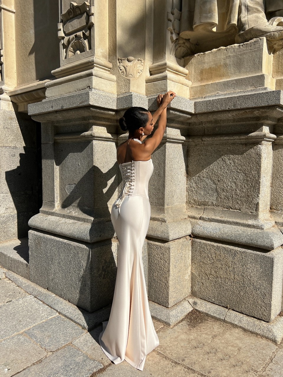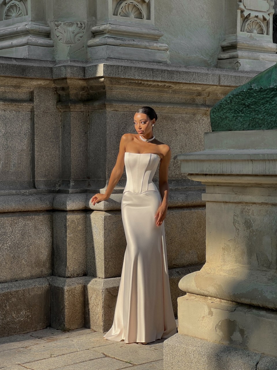 Виготовлена з щільного преміального атласу, який м’яко огортає силует, створюючи розкішне, але стримане сяйво.