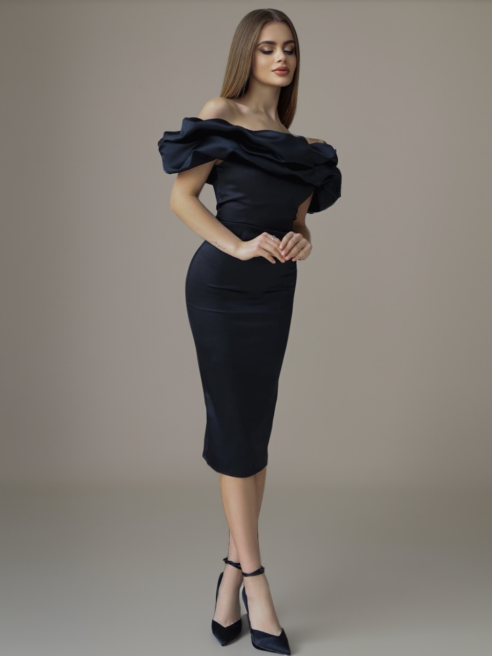 Мідісукня на корсетній основі зі зборкою на плечах "Enchanting Blossom" в чорному кольорі. Ця сукня - втілення вічної елегантності та вишуканості. Виготовлена з розкішного матового атласу вона поєднує структуровану красу корсета та плавну грацію сукні. Чорний колір додає образу чистоти та витонченості, що робить сукню ідеальним вибором для весіль, офіційних заходів або будь-якої події, де ви хочете виглядати елегантно.