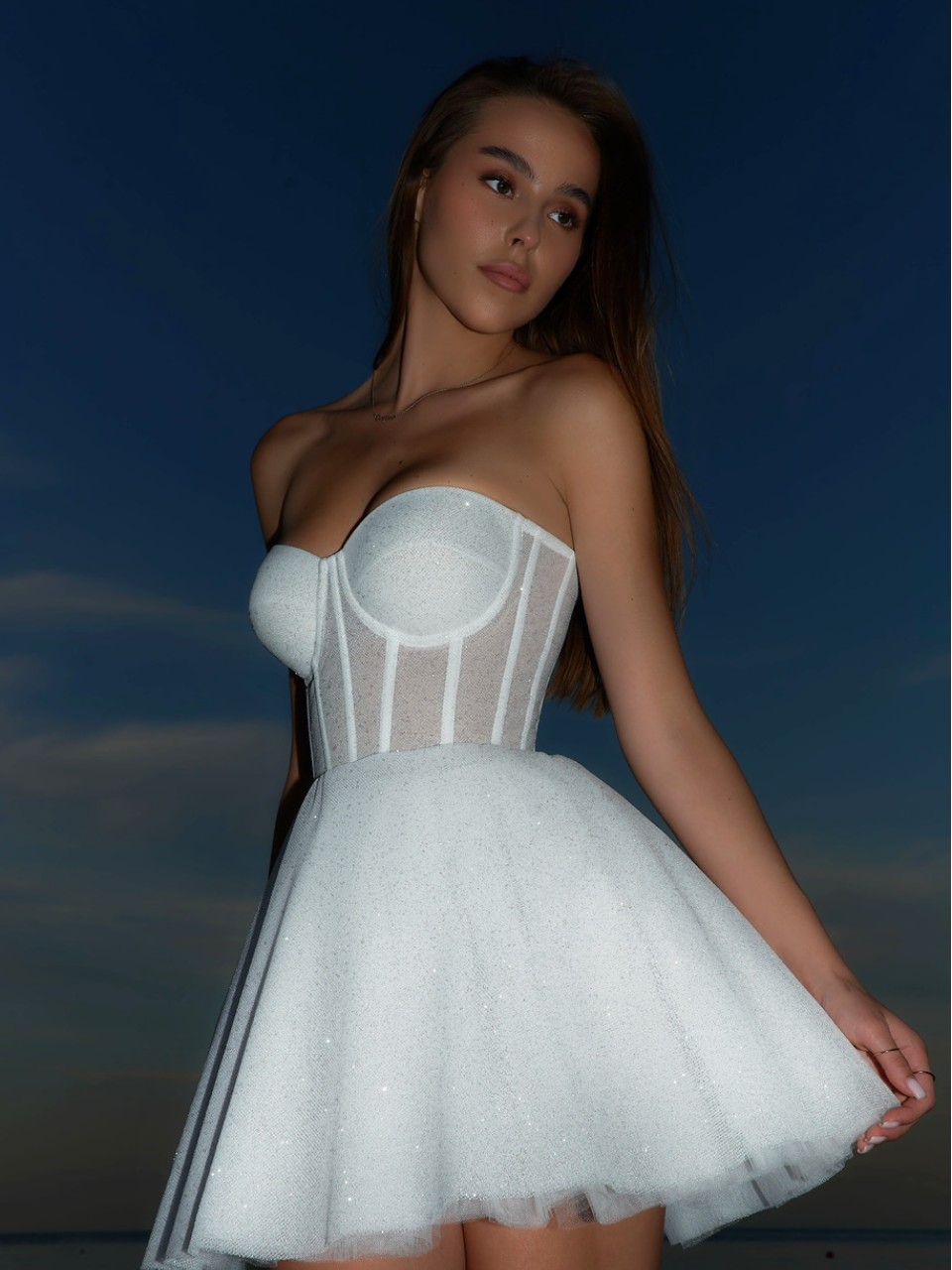 "Freya" - сукня довжини міні з чашечками, вкрита блискітками та мерехтить при освітленні. Сукня виготовлена зі спеціальних спіральних металевих кісточок, які підлаштовуються під вашу фігуру. Сукня щільно прилягає до тіла, шнурівка на спині дозволяє регулювати утягнення.