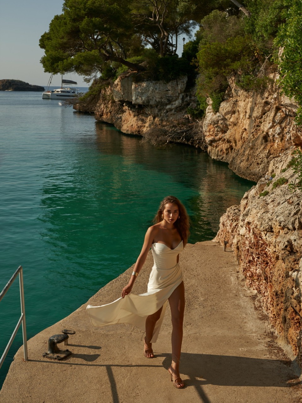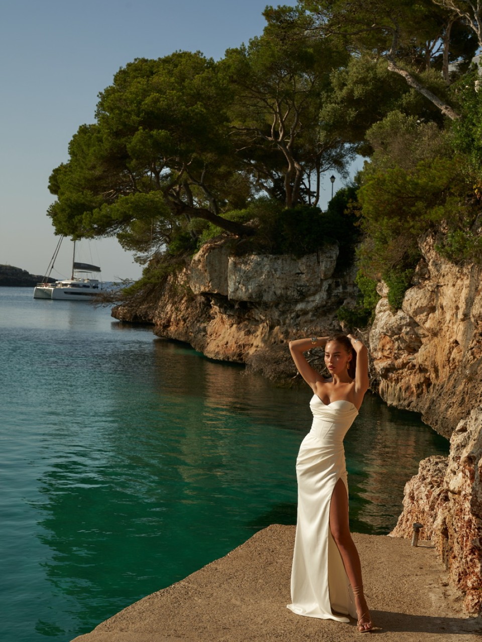 Корсетна сукня з спідницею на запах в довжині максі та драпіруванням на декольте "Moonlit Whisper", виготовлена з якісного атласу. Шнурівка на спині дозволяє регулювати утягнення та розмір.