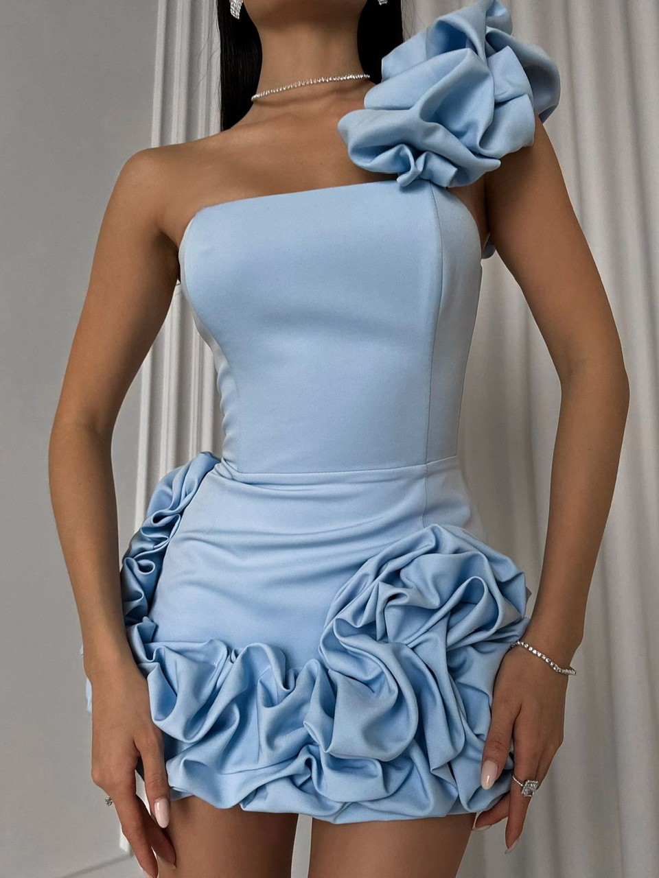 Корсетна сукня "Bloom" виготовляється за індивідуальними мірками, що забезпечує бездоганну посадку, поєднуючи комфорт та елегантність. Ніжний блакитний відтінок додає образу свіжості та спокою, роблячи цю сукню ідеальним вибором для тих, хто прагне сучасного і вишуканого образу.
