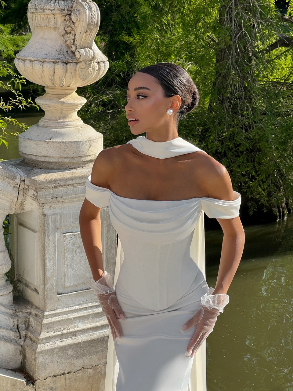 Драпірування на ліфі пом’якшує чіткі лінії корсета, створюючи відчуття руху й загадковості. У поєднанні з довгою, струмливою спідницею цей образ говорить мовою стриманої впевненості. Для жінки, яка дозволяє деталям сказати головне.