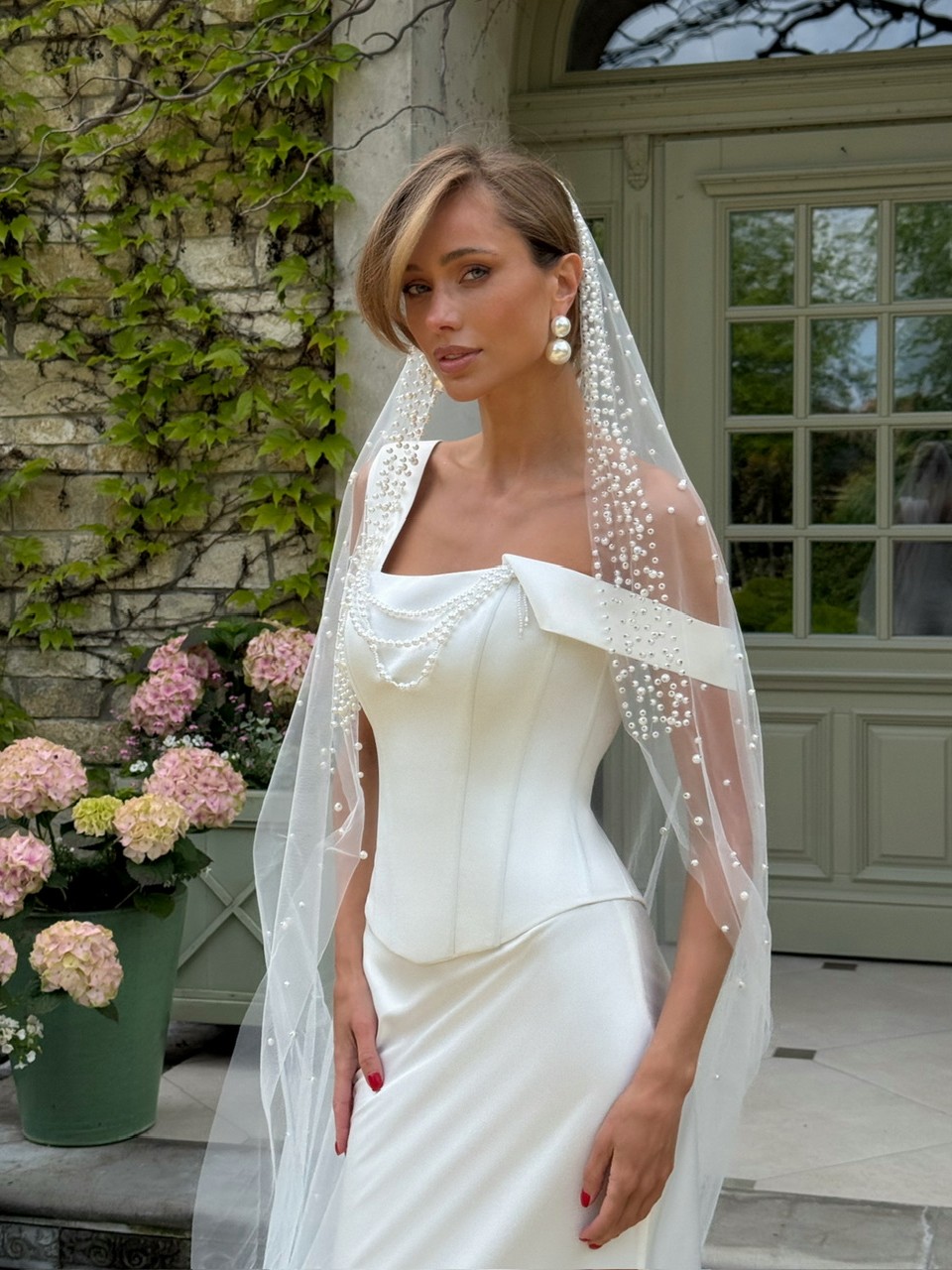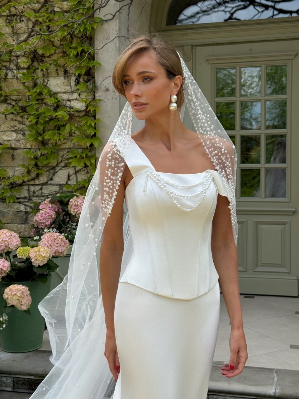 Корсет з бретелями делікатно оздоблений мініатюрними перлинами — вони ніжно виблискують при світлі, не перевантажуючи образ, а лише підкреслюючи його вишуканість. Лаконічний крій корсета чудово формує силует.