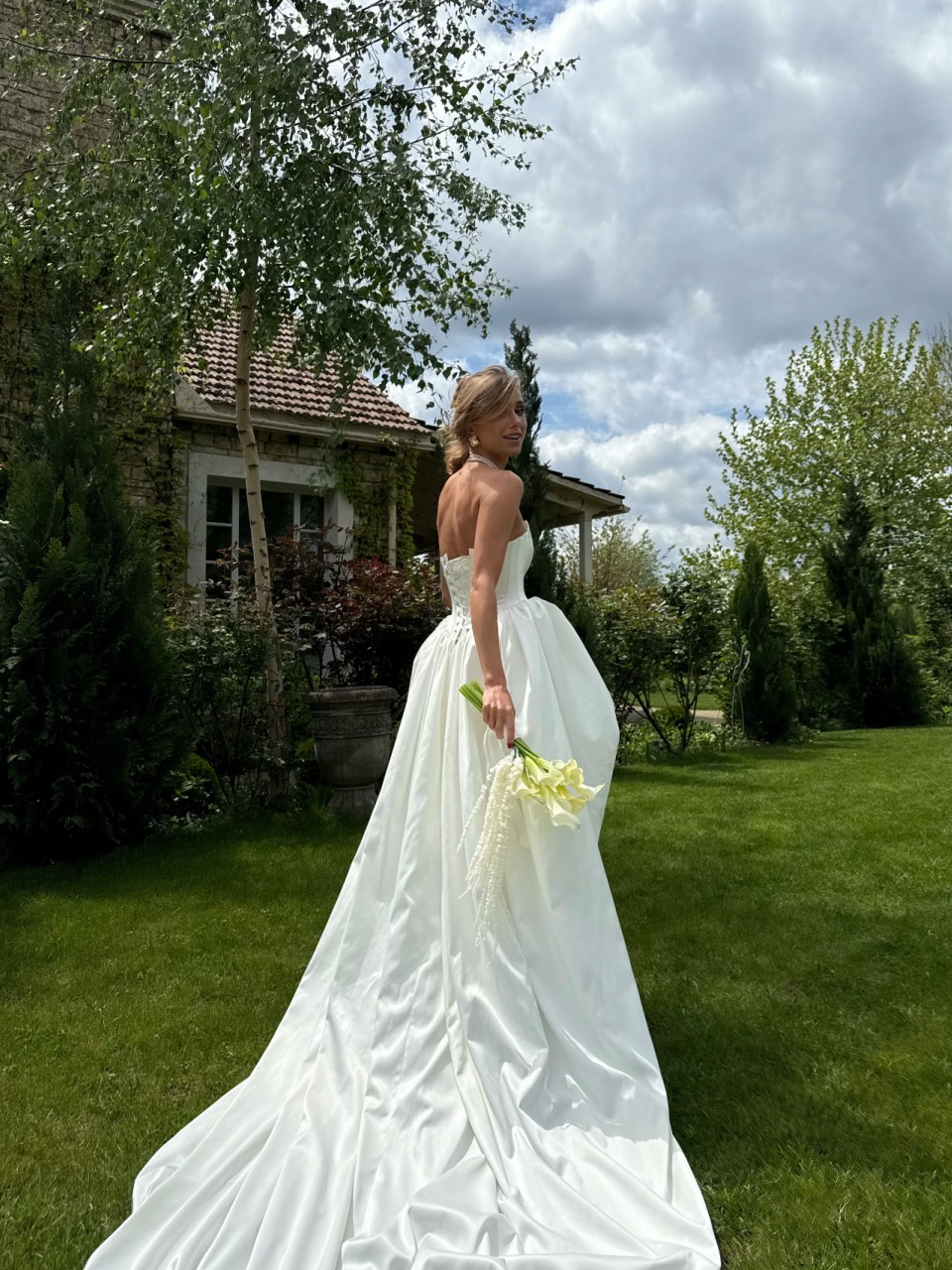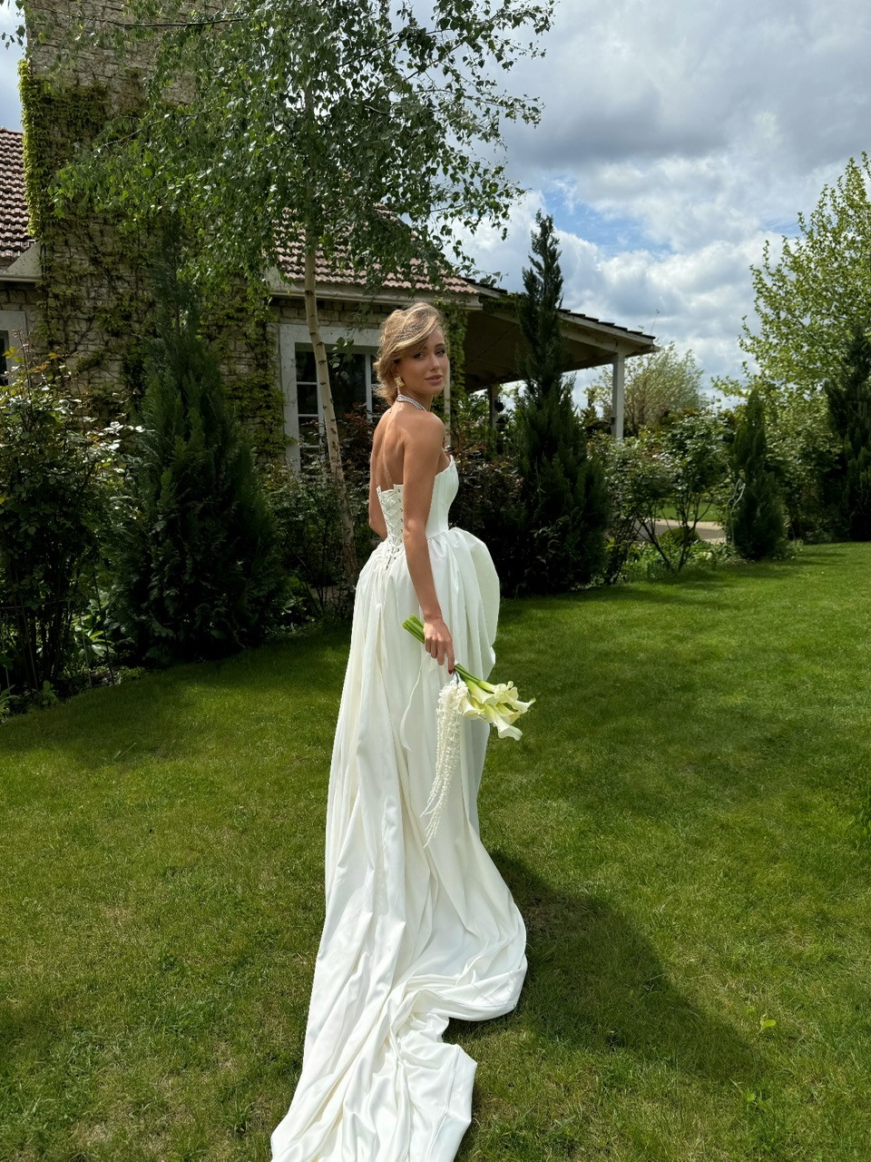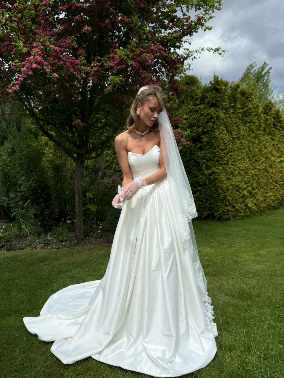 Сукня створена з преміального атласу перлинного відтінку.