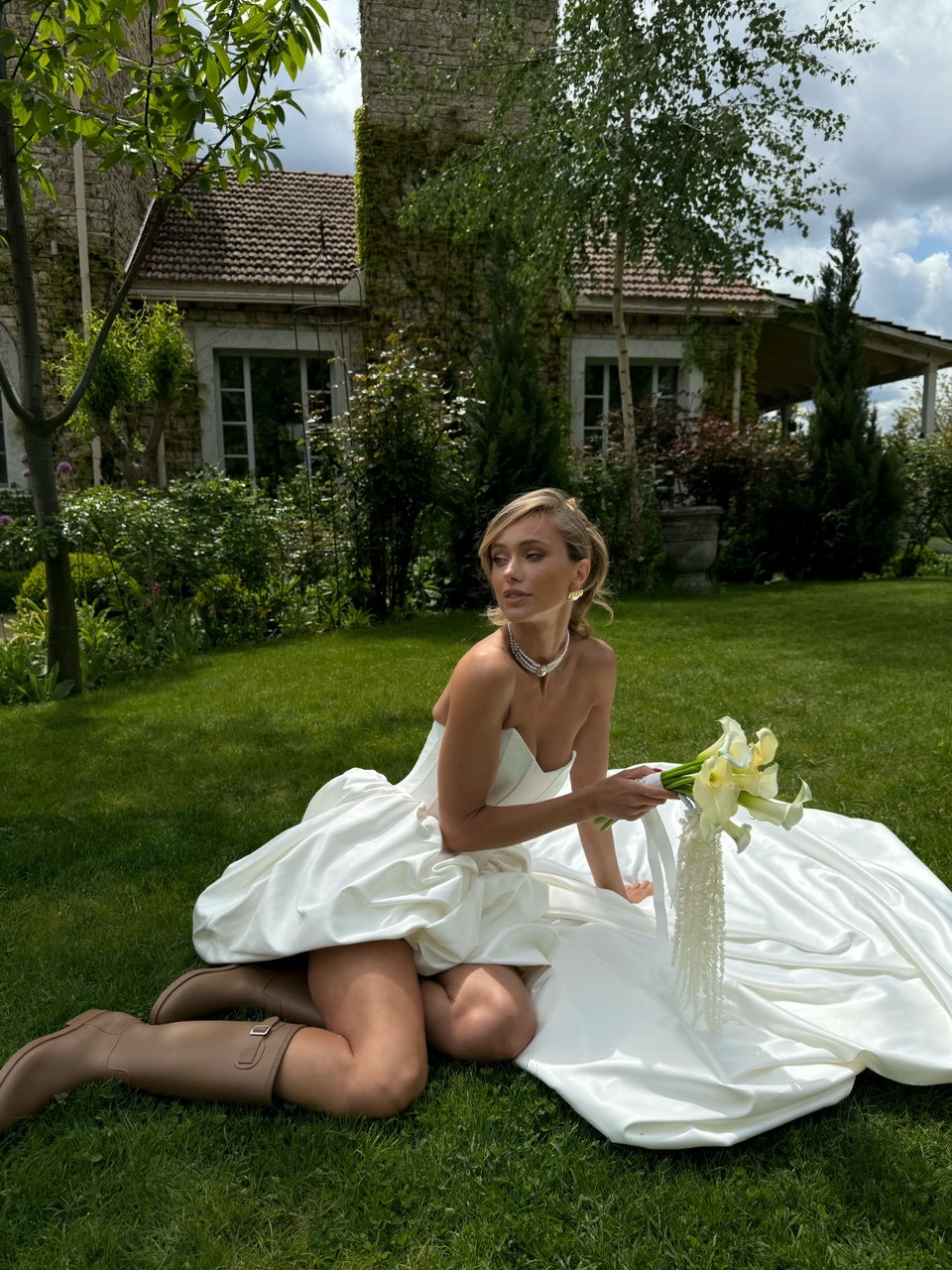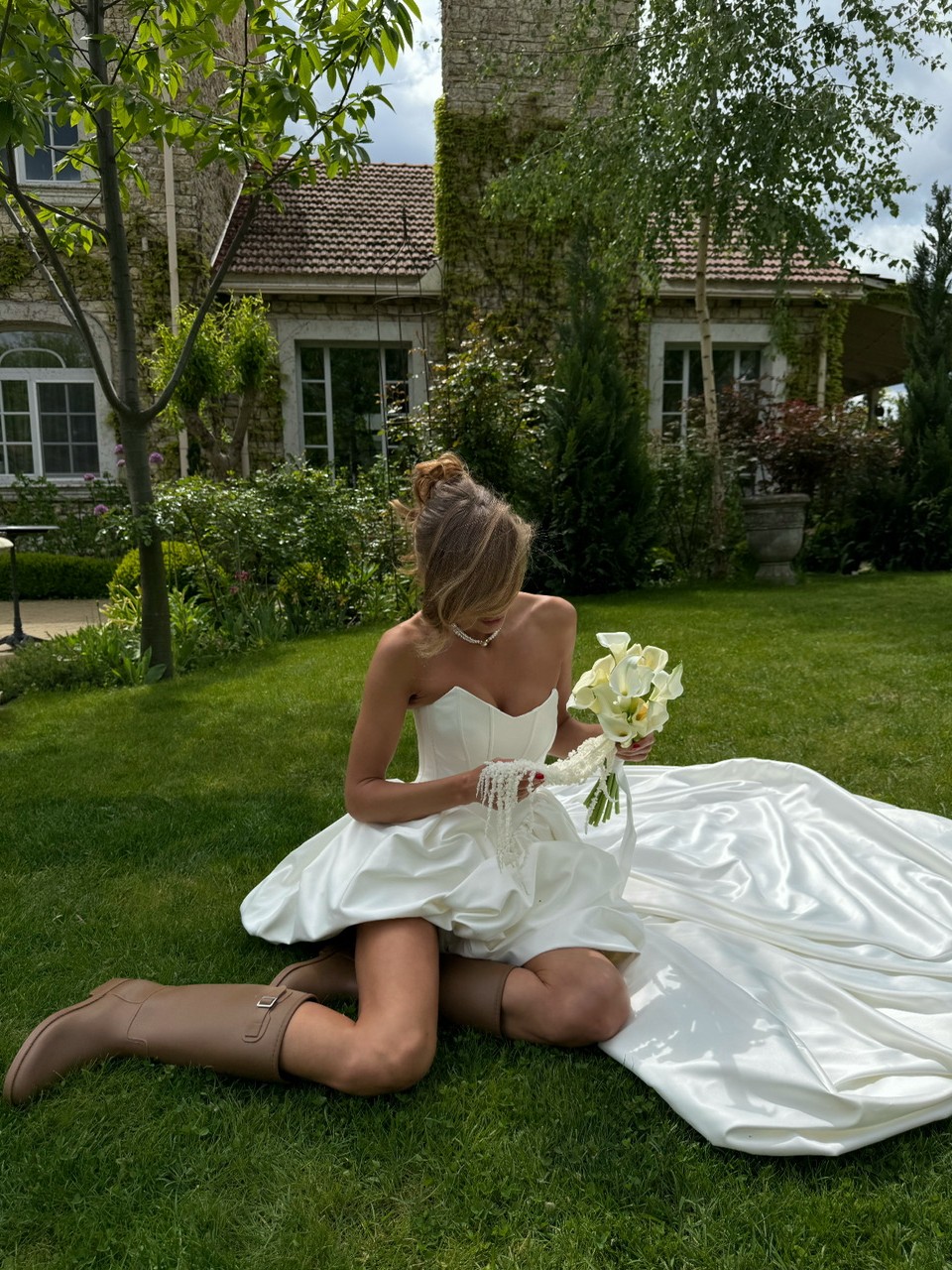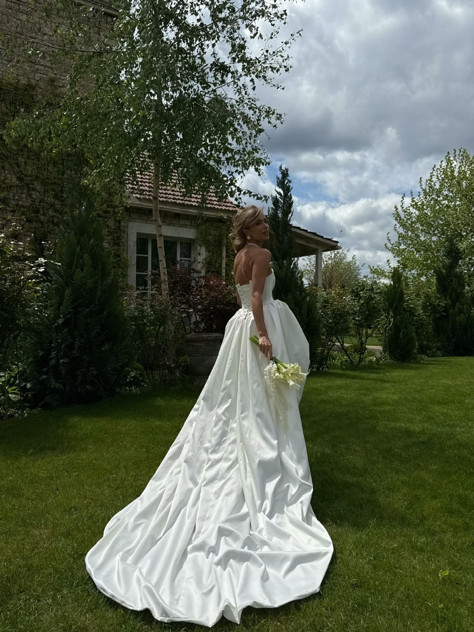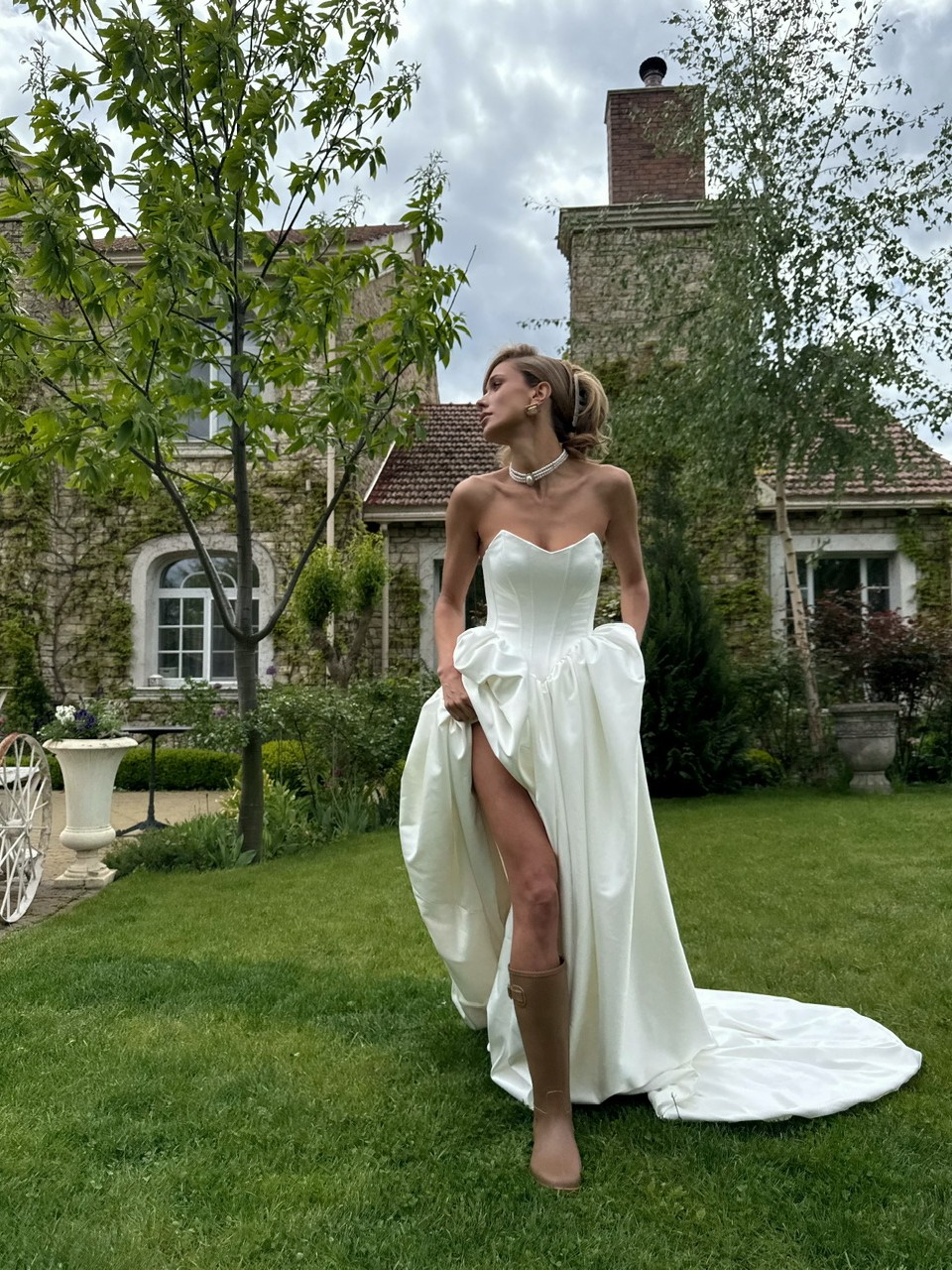 Сукня створена з преміального атласу перлинного відтінку.