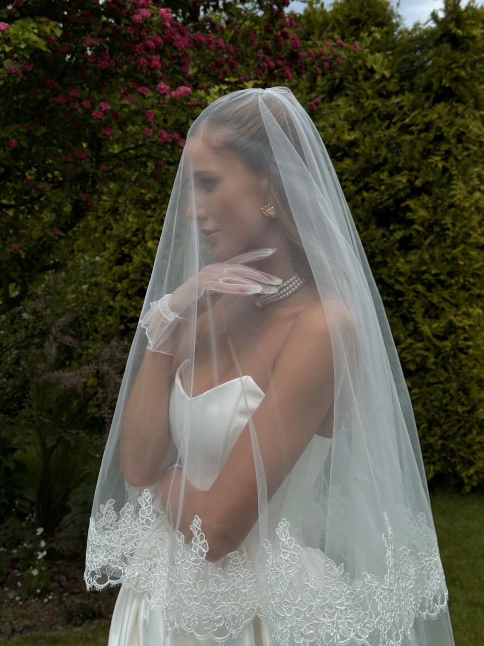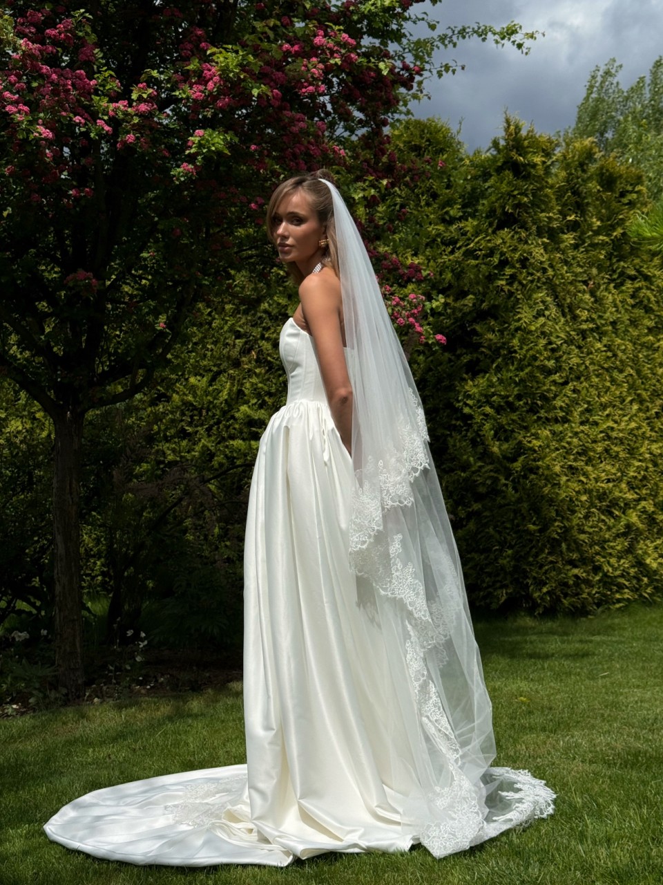 Ця весільна сукня — справжнє втілення жіночності й королівського шарму. Пишна спідниця створює розкішний об’єм і дарує кожному кроку відчуття легкості та величі. Приталений корсет ідеально моделює силует, підкреслюючи талію.